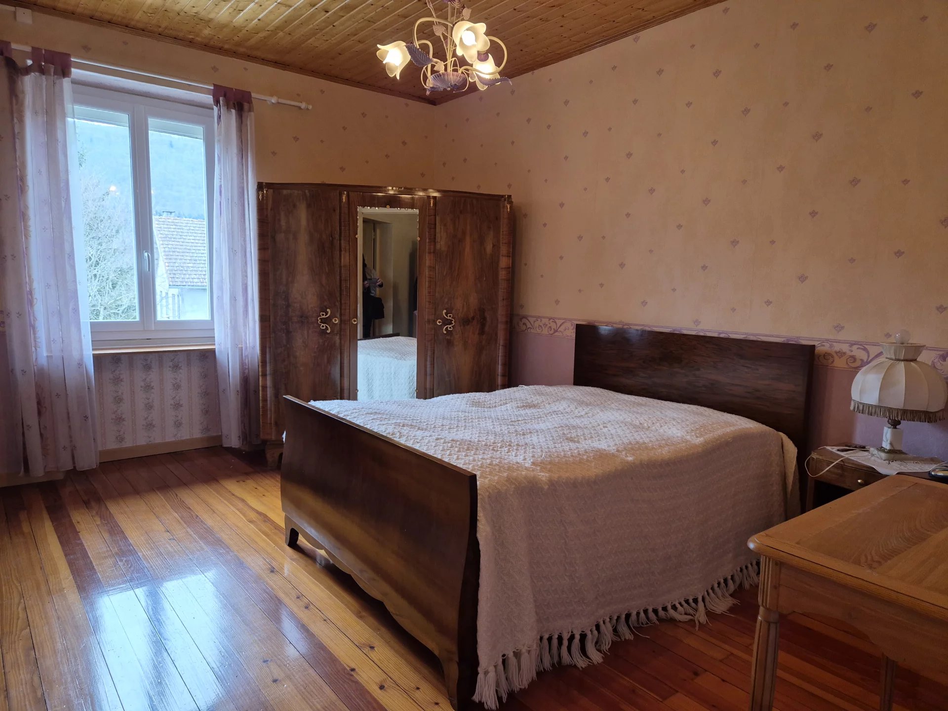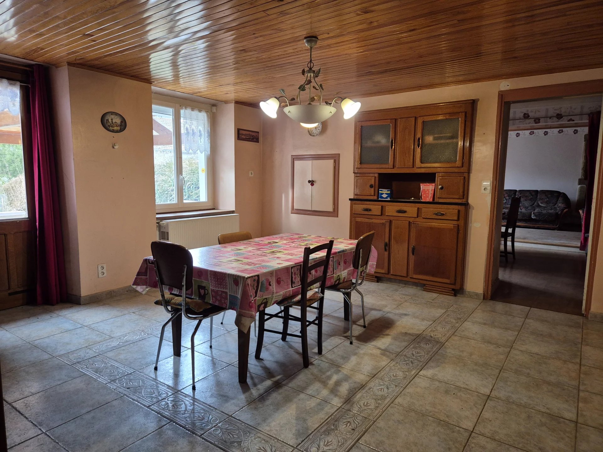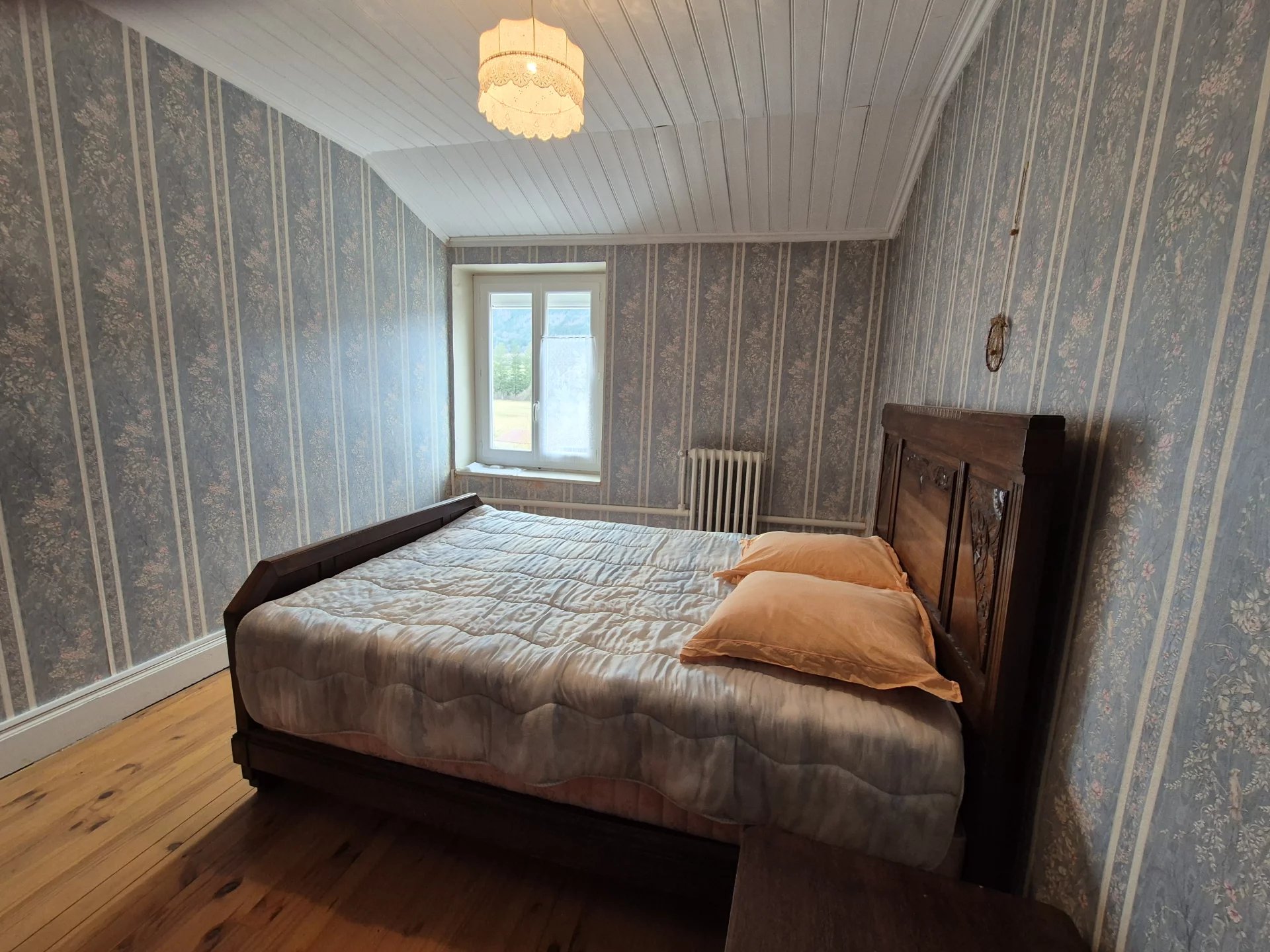 À l’étage, un dégagement avec un grand placard mural dessert une salle d’eau avec WC et trois chambres. Un vaste grenier vient compléter l’espace (La toiture, recouverte de tuiles est en très bon état).