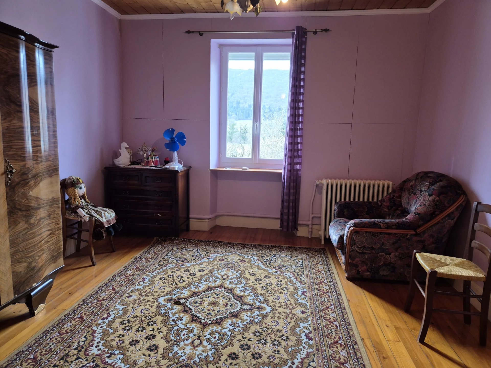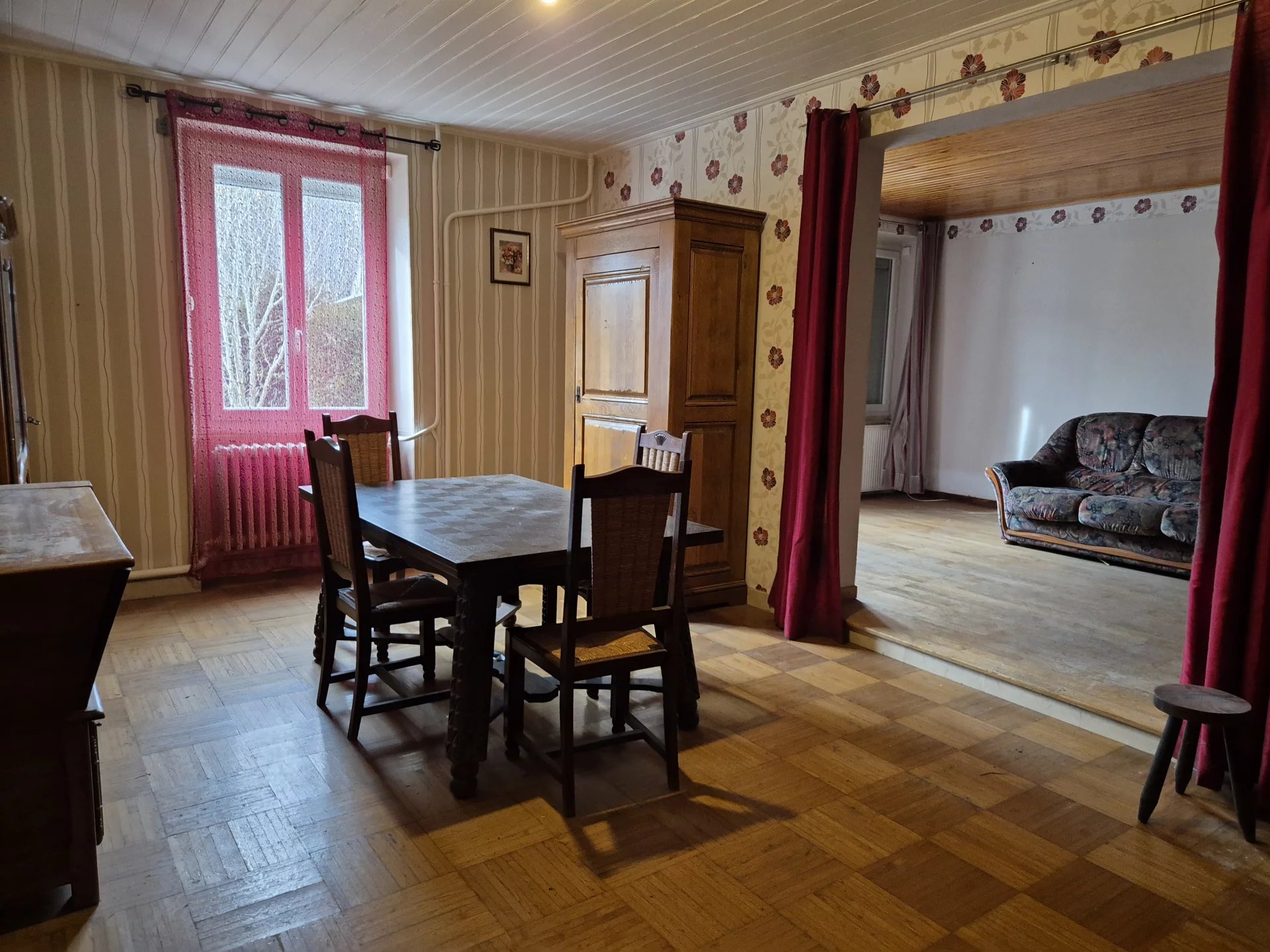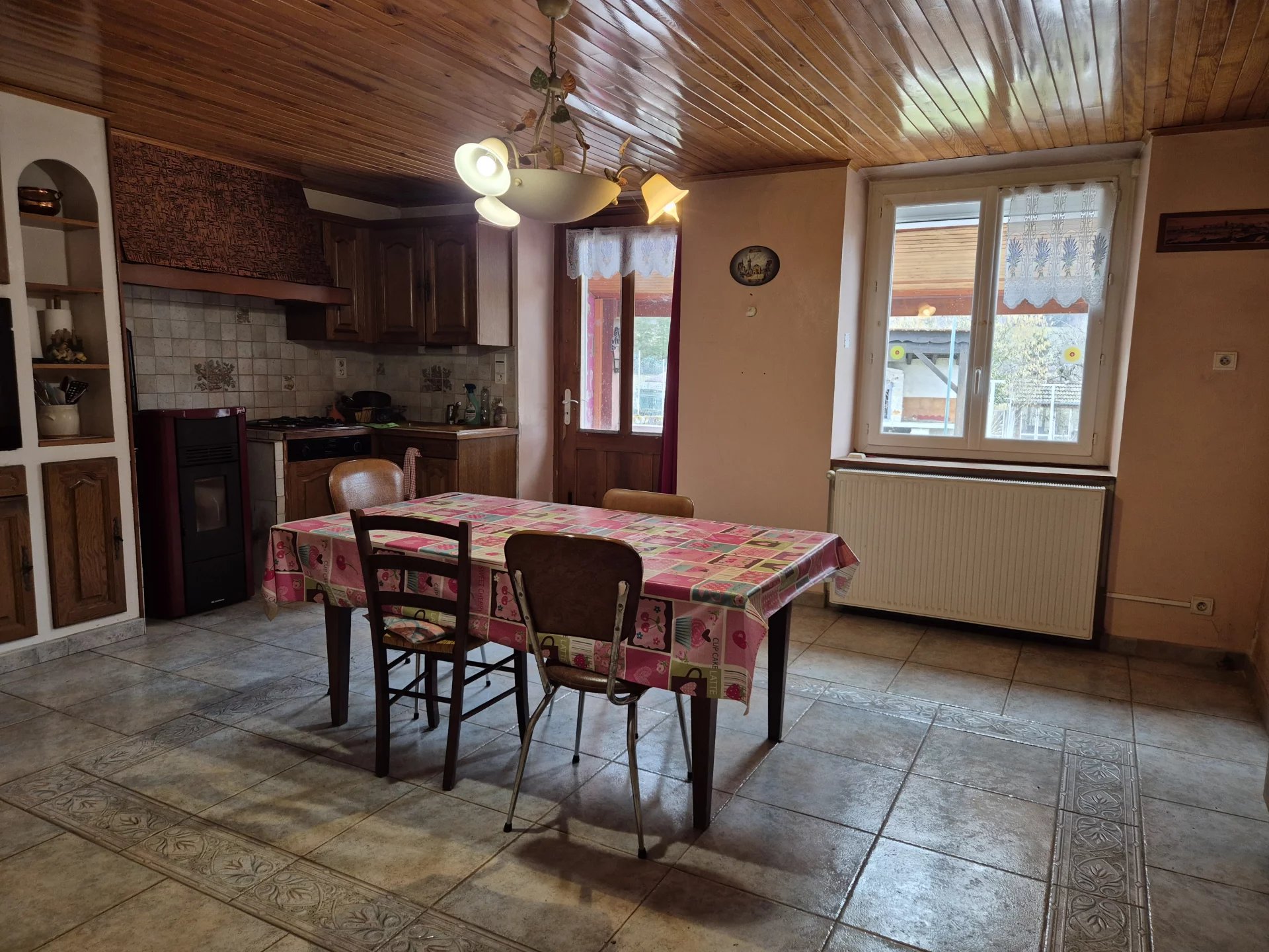 À l’étage, un dégagement avec un grand placard mural dessert une salle d’eau avec WC et trois chambres. Un vaste grenier vient compléter l’espace (La toiture, recouverte de tuiles est en très bon état).