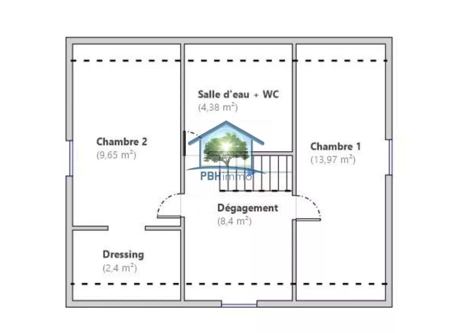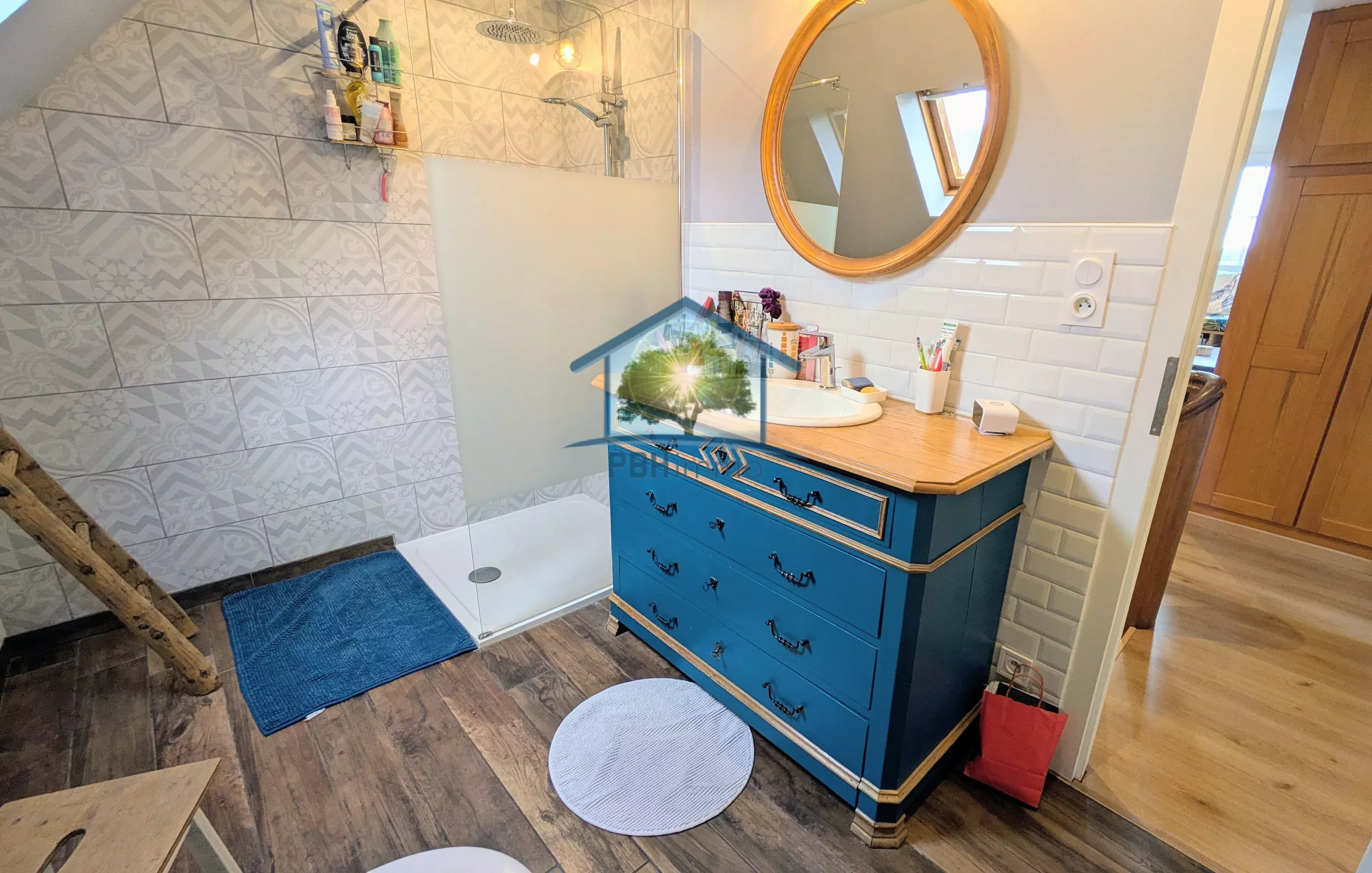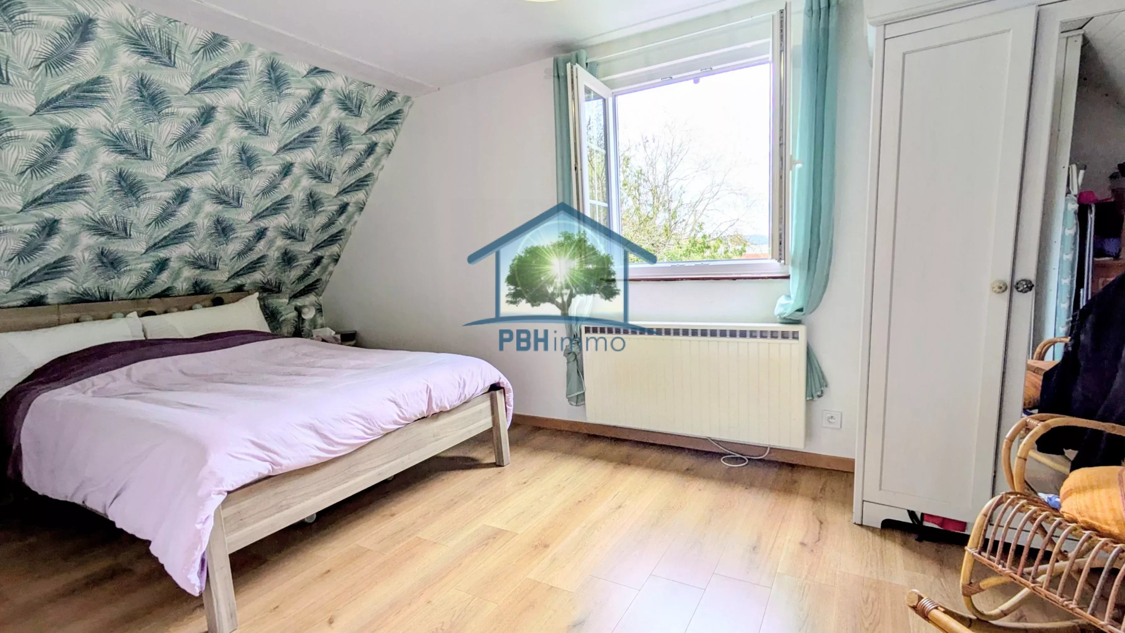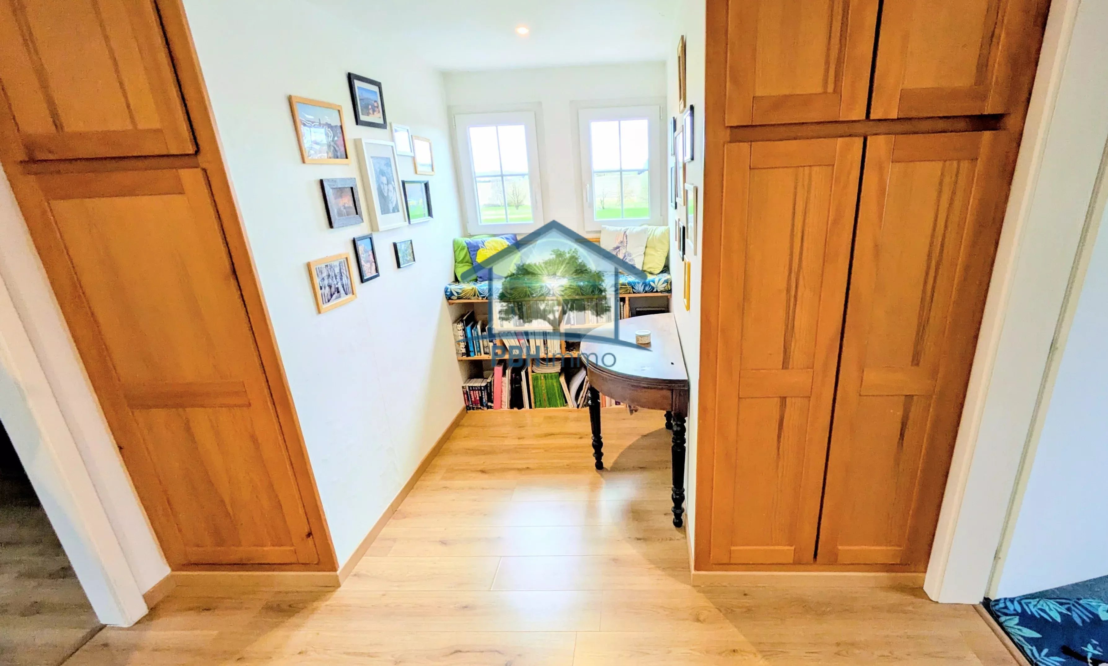 A L'ETAGE, nous avons un dégagement avec placards de rangement pour y installer un bureau, 2 belles chambres dont une avec dressing et d'une salle d'eau avec WC.