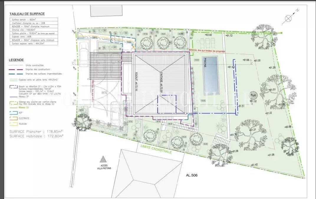 Le projet, conçu par un architecte, prévoit la construction d'une villa contemporaine d'environ 200 m² habitables, complétée par 100 m² de sous-sol, une piscine, et une plateforme de stationnement pour plusieurs véhicules.